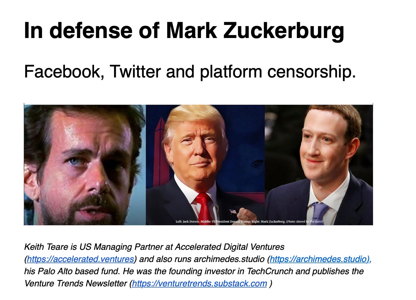 This week’s venture trends includes news of a crisis surrounding the social media platforms in relation to free speech and censorship. I have penned an essay on the topic: