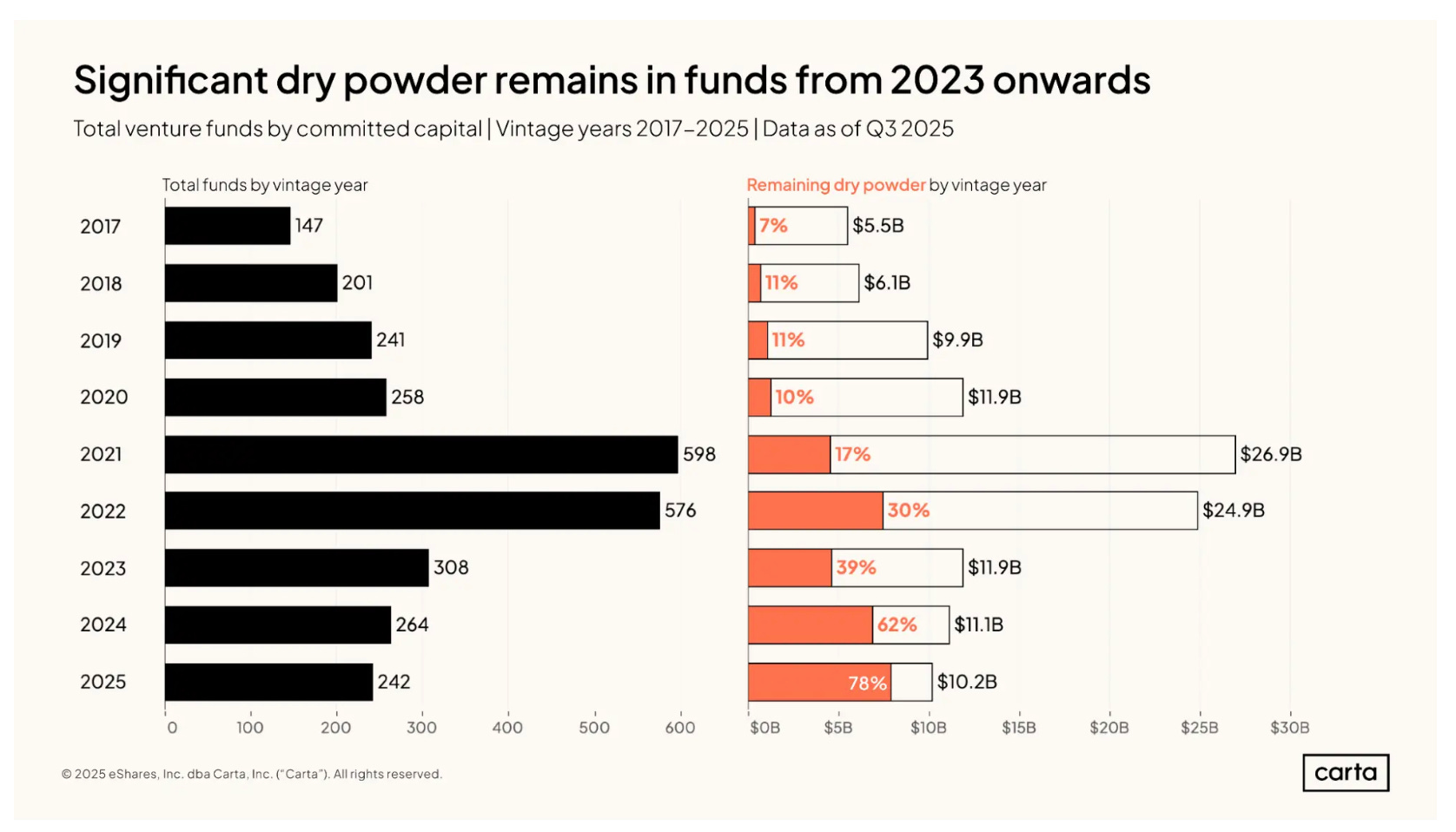 When you look at where uninvested capital sits, as expected, newer funds (2023 vintages and beyond) have most of the dry powder. Recent fund vintages have had a higher percentage of small funds - larger funds have dominated. So while fewer in number, large funds hold a disproportionate share of remaining dry powder.