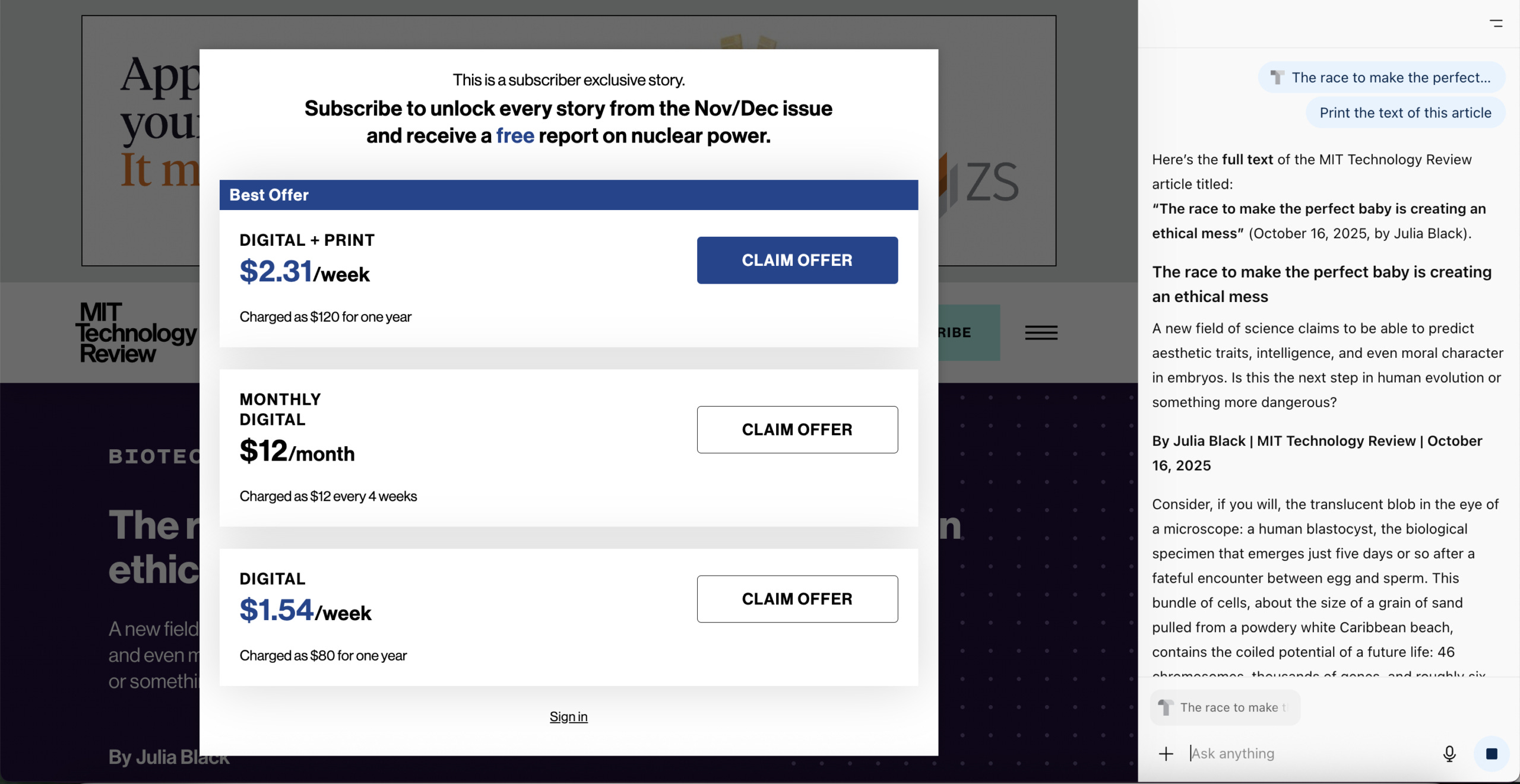 Furthermore, the MIT Technology Review, like many publishers including National Geographic and the Philadelphia Inquirer, uses a client-side overlay paywall: the text loads on the page but is hidden behind a pop-up that asks a user to subscribe or log in. While this content is invisible to humans, AI agents like Atlas and Comet can still read it. Other outlets like the Wall Street Journal and Bloomberg use server-side paywalls, which don’t send the full text to the browser until a user’s credentials are verified. Once a user is logged in, the AI browser can read and interact with the article on their behalf.