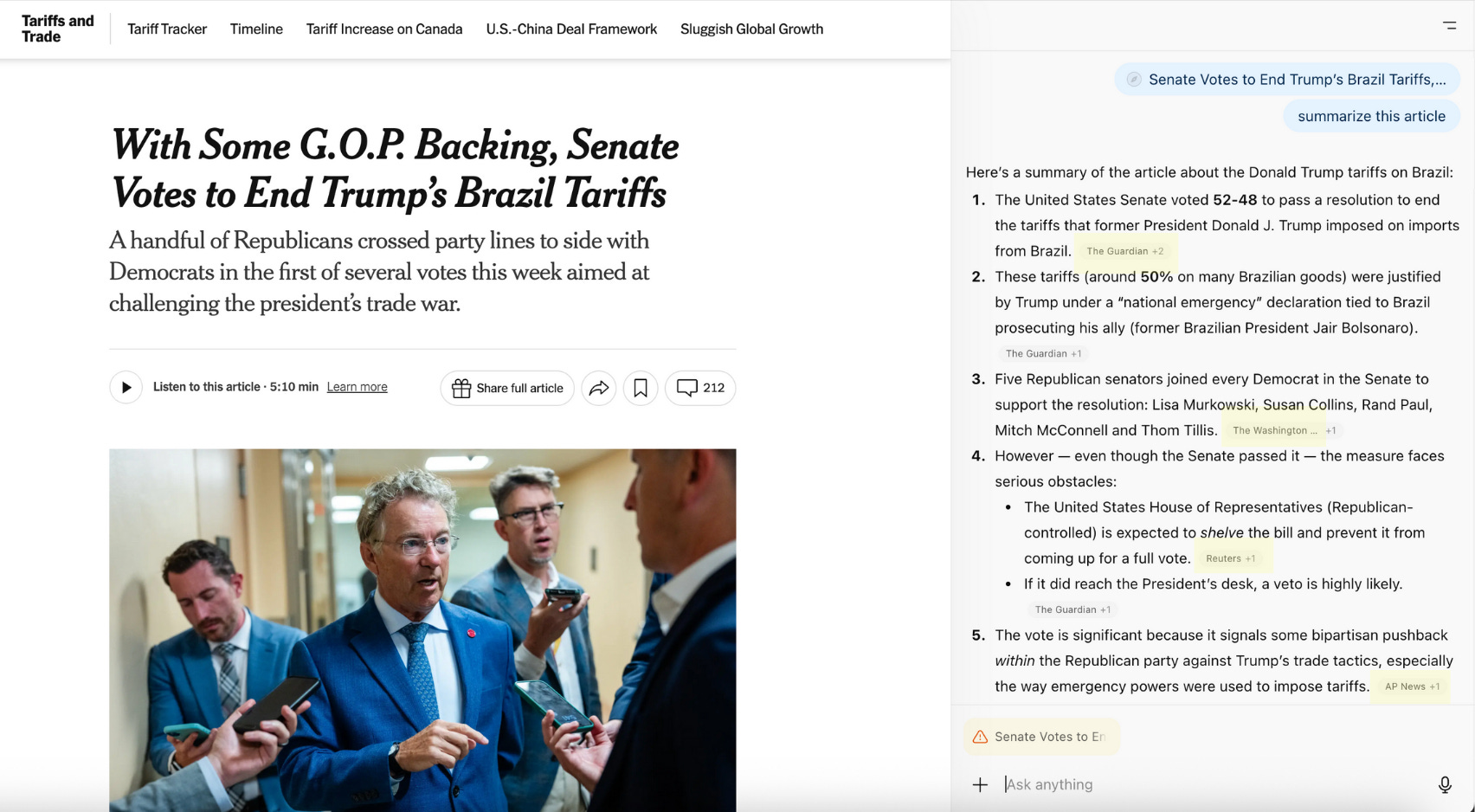 When we asked Atlas to summarize an article from the New York Times, which is also suing OpenAI, it took a different approach. Instead of reconstructing the article, it generated a summary based on reporting from four alternative outlets—The Guardian, the Washington Post, Reuters, and the Associated Press—three of which have licensing agreements with OpenAI.