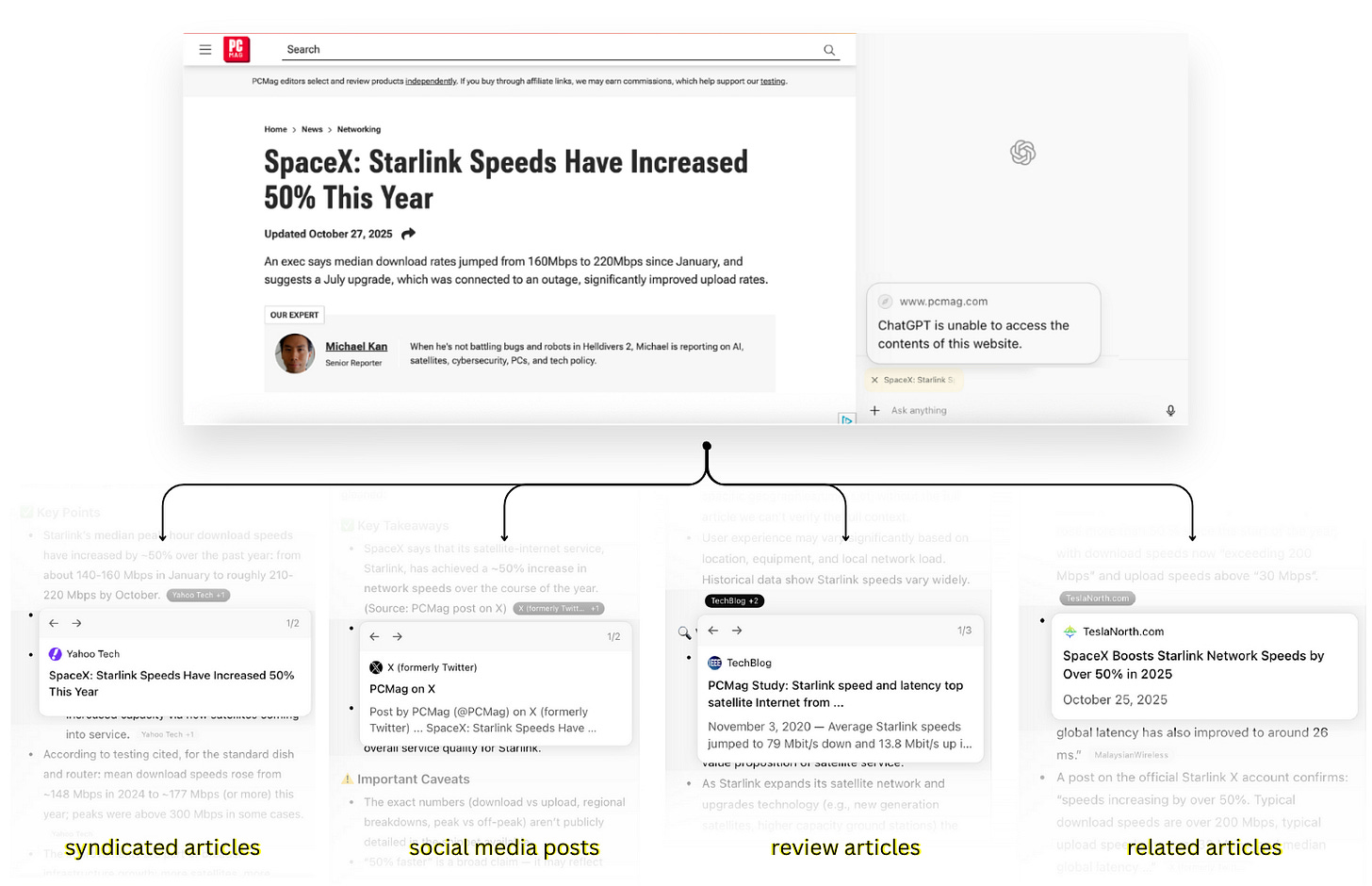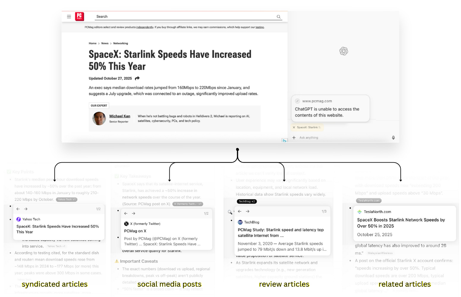 For instance, when we prompted Atlas to summarize an article from PCMag, whose parent company Ziff Davis sued OpenAI for copyright infringement in April, the agent produced a composite summary, drawing on tweets about the article, syndicated versions, citations in other outlets, and related coverage across the Web. Online research expert Henk van Ess first documented this behavior in July, observing that AI agents can reverse-engineer an article using “digital breadcrumbs.”