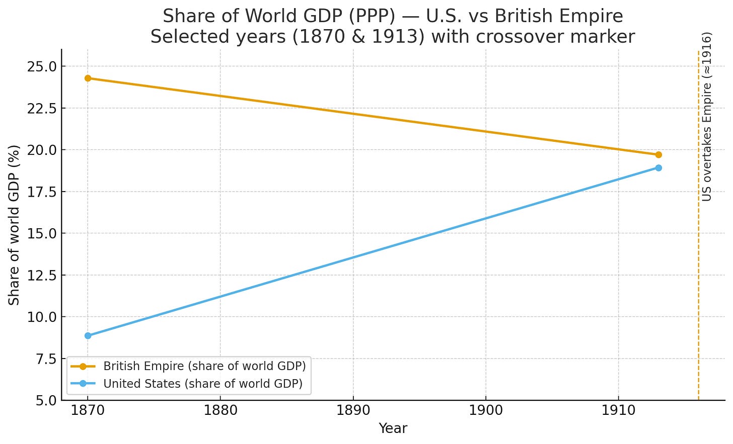 The last time the world witnessed such a shift in global economic weight was between 1870 and 1918, when the United States caught up to and then surpassed the British Empire in share of world GDP. That transformation marked the beginning of a new global order — one driven by industrialization, innovation, and scale.