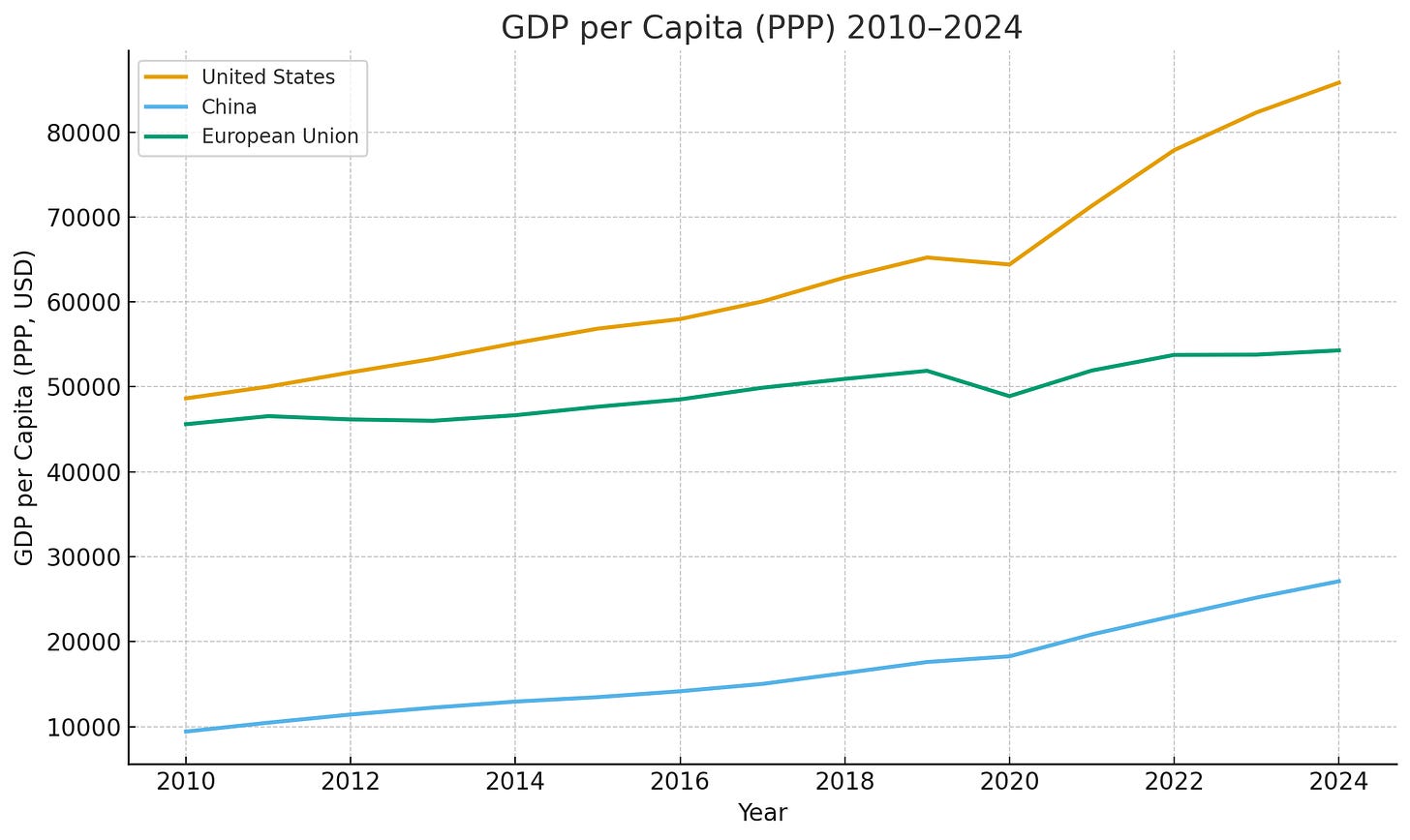 PPP reflects real domestic consumption and production capacity, not just exchange-rate value. On a per-capita basis, however, the gap remains large: the U.S. stands at about $67,000 nominal GDP per person, while China reaches $13,000. Adjusted for PPP, those figures become $86,000 for the U.S. and $27,000 for China. The European Union sits between them, at roughly $54,000 per person.