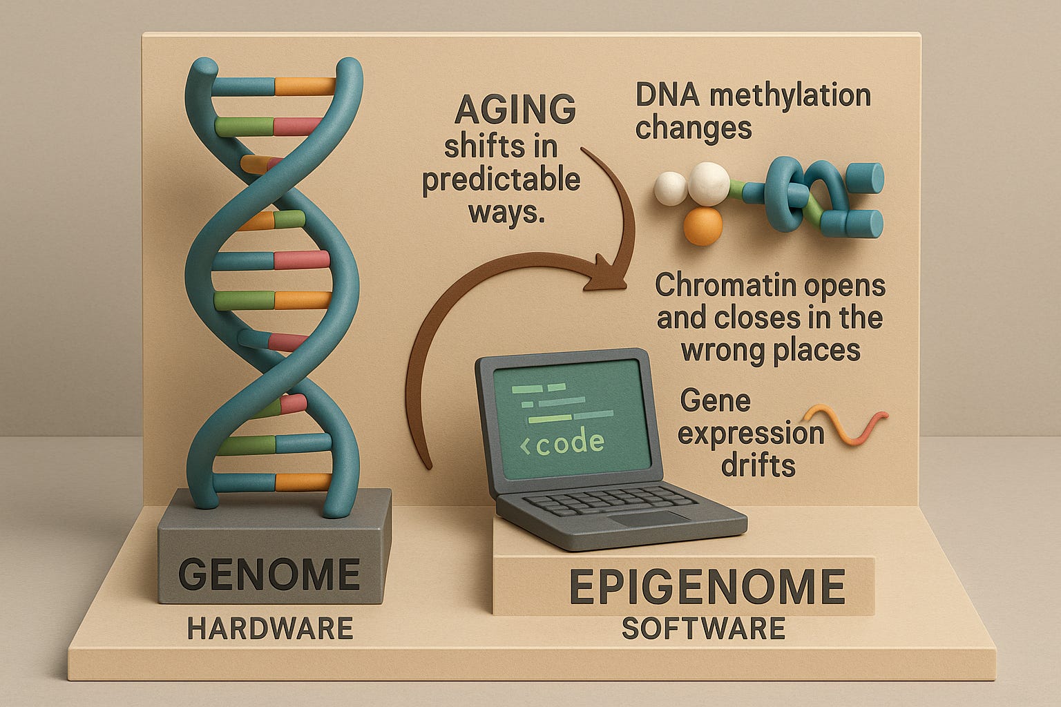 Think of the genome as hardware, and the epigenome as software that tells the hardware what to run. Aging shifts that software in predictable ways. DNA methylation changes, chromatin opens and closes in the wrong places, and gene expression drifts.