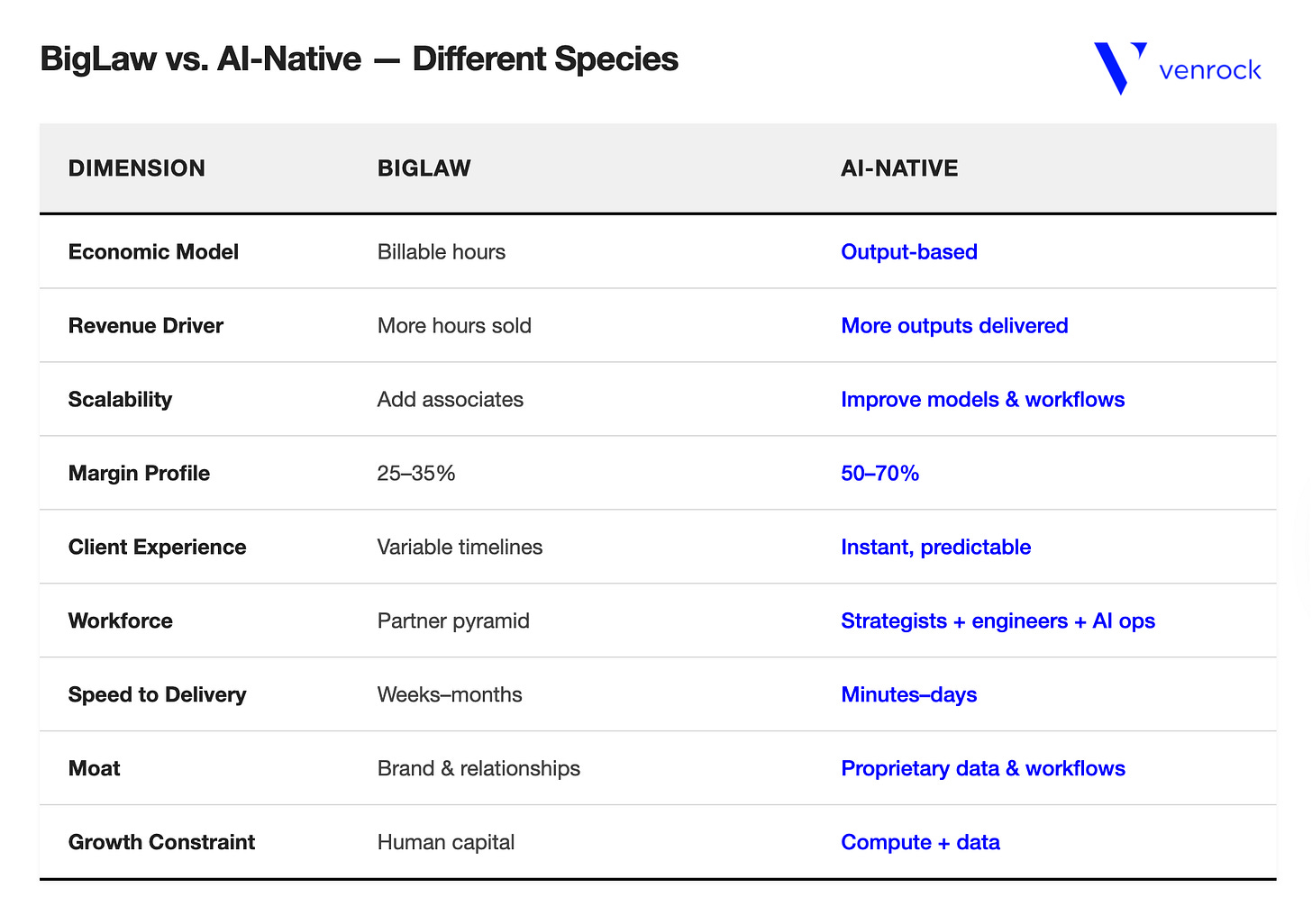 But all monopolies eventually face their reckoning. When the marginal cost of diligence, drafting, or research approaches zero, pricing based on time becomes indefensible. Every other industry where technology erased time as the primary cost driver—trading, advertising, parts of consulting—saw incumbents lose pricing power overnight. Law is the last great holdout.