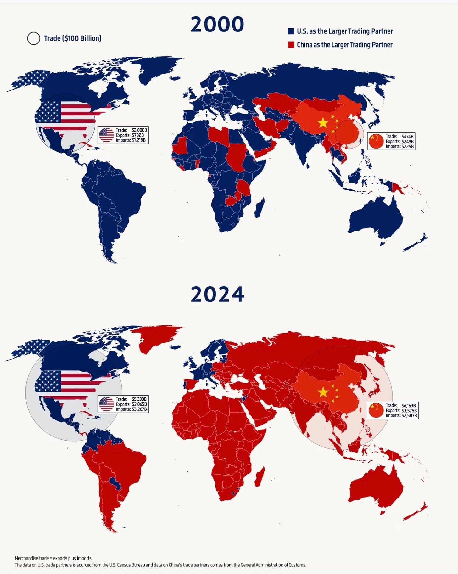 By 2024, total trade reached $5.3 trillion for the U.S. and $6.2 trillion for China. China is now the dominant trade partner for most of Asia, Eastern Europe, the Middle East, Oceania, South America, and Africa. Looking forward, China is expected to continue to deepen its relationships with emerging markets—importing fuels, minerals, and agricultural goods, and exporting manufactured products.