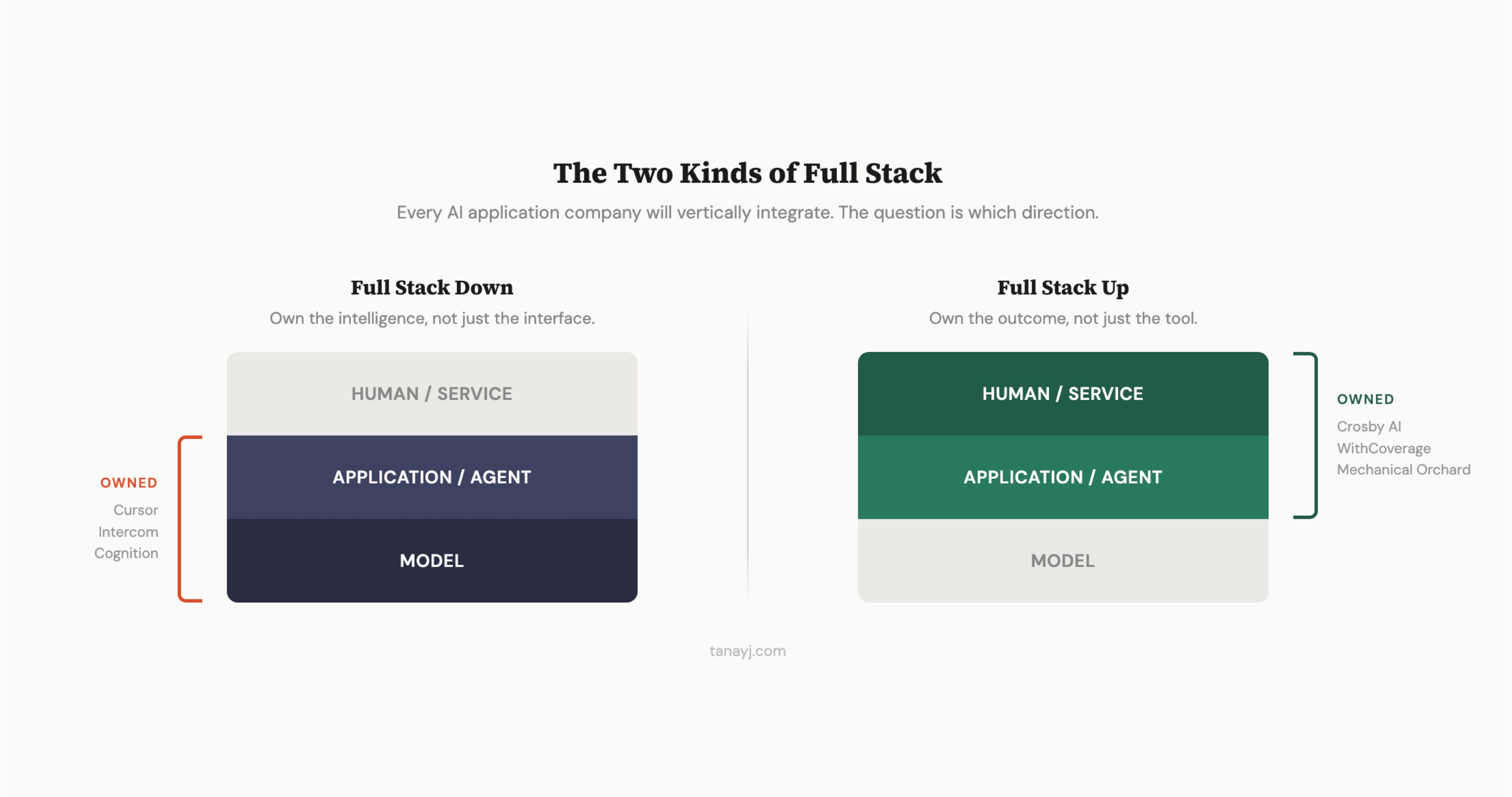 A Wing VC partner maps the pattern emerging across AI application companies: they all become “full-stack.” The framework is three layers — model, application/agent, and human/service — and successful companies integrate in one of two directions. Some move down into the model layer (Cursor training its own Composer 2 coding model, Intercom building Fin Apex for customer service). Others move up into the service layer, adding human operations to guarantee outcomes. The downward integrators chase a flywheel: better product → more usage → more proprietary traces → better fine-tuned model → better product. The upward integrators chase a different one: guaranteed outcomes → pricing power → margin for human review → trust → more enterprise deals. Both paths produce defensibility that pure middleware lacks. The implication for founders: if you’re building an AI application and not planning to integrate in at least one direction, you’re building a feature, not a company.