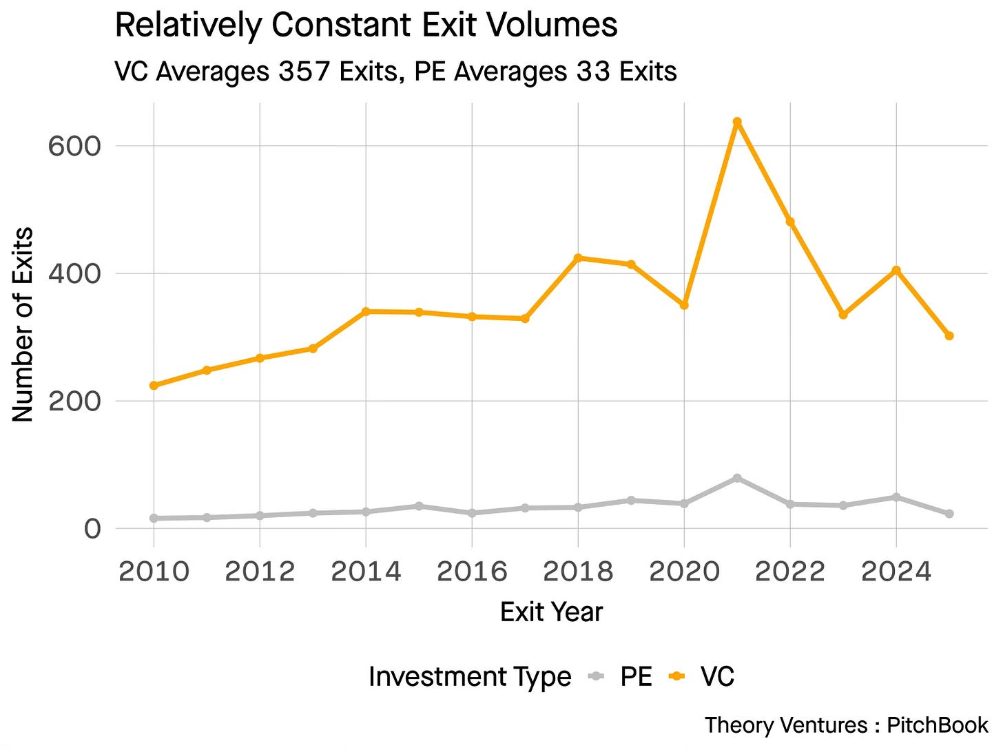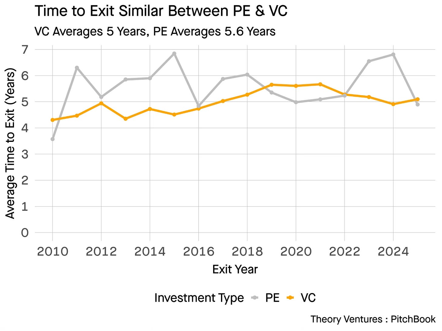 Conor Quigley at PitchBook ran an analysis on Theory’s behalf to answer the question: How many years from the first funding round to exit on average between PE & VC?