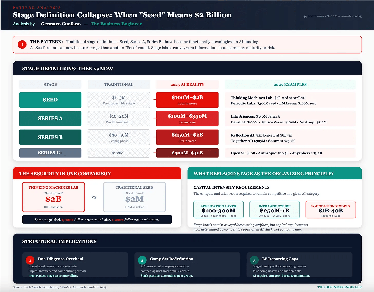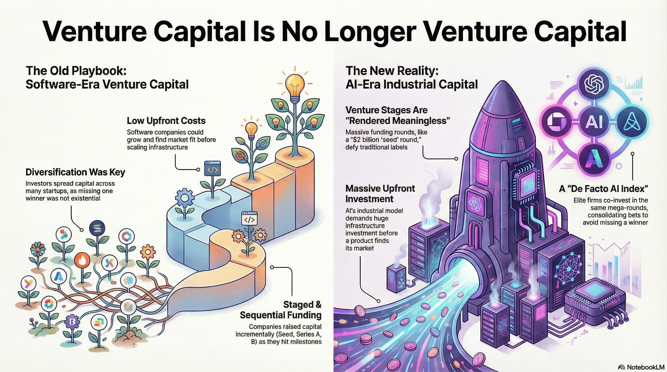 The most visible sign of this new reality is the effective destruction of traditional venture capital stages. Labels like Seed, Series A, and Series B have been “rendered meaningless” by the sheer capital required to compete in AI. In the past, software companies could grow incrementally, raising capital as they hit milestones. AI, however, has shifted the field to an “industrial model” that demands massive infrastructure investment long before a product finds its market.