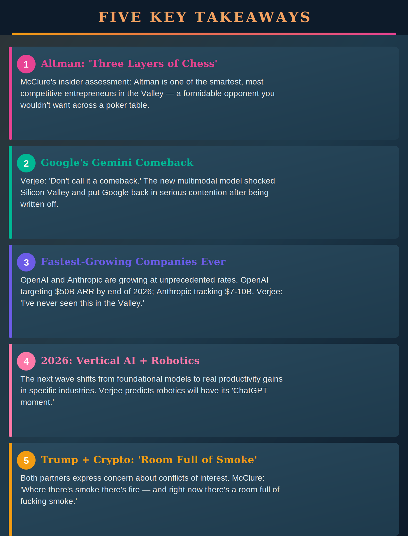 In this refreshingly unfiltered conversation, they assess tech’s two most dominant titans: Sam Altman and Elon Musk. McClure describes Altman as someone he’d never want to face across a poker table — “there’s probably three layers of chess going on in his head.” Verjee breaks down the competitive psychology driving Musk as OpenAI’s valuation leapfrogs SpaceX.