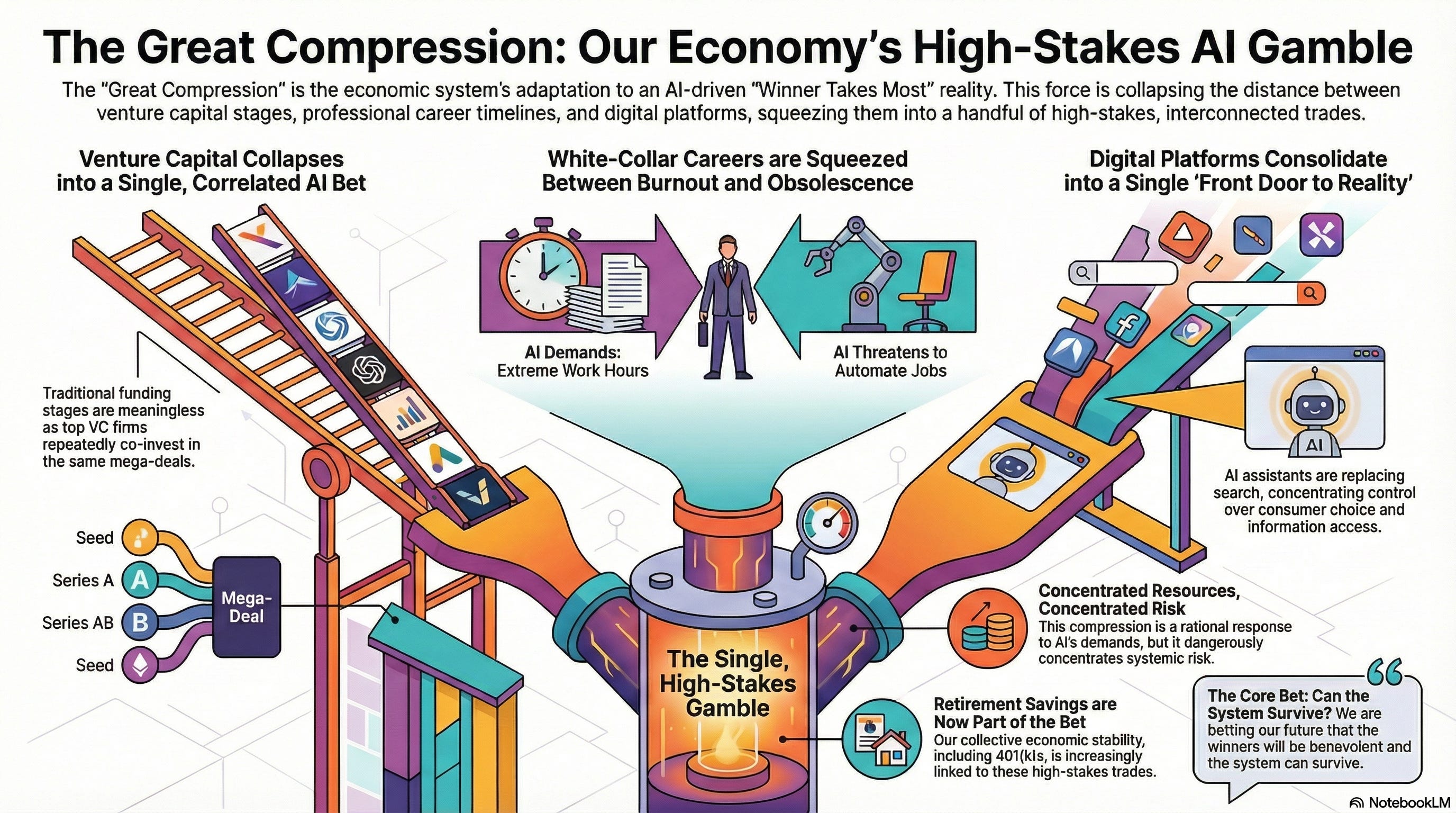 The Great Compression is the economic system’s logical adaptation to a “Winner Takes Most” reality. Venture capital has collapsed into a single, correlated bet on AI because the industrial scale of the technology requires it. Professional careers are being squeezed because only high-level judgment retains value in an automated world. And digital platforms are consolidating because the interface that wins the user’s trust wins everything.
