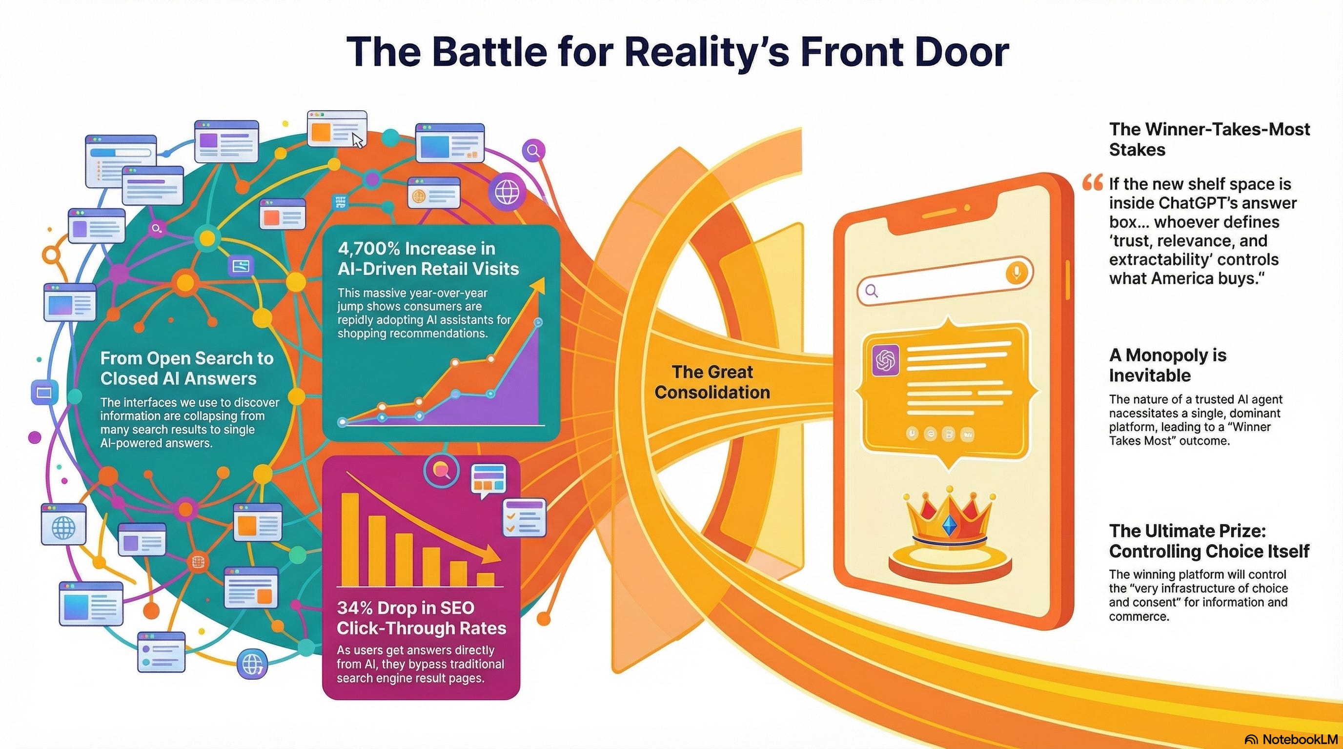 The same forces compressing capital and careers are fueling a final, decisive battle: the fight to control the “front door to reality.” We are witnessing a massive consolidation of the interfaces we use to discover information, shifting from a web of open search results to singular, definitive AI answers. The trend is already underway, with data showing a “4,700% year-over-year increase in retail visits driven by AI assistants” alongside a significant drop in SEO click-through rates.